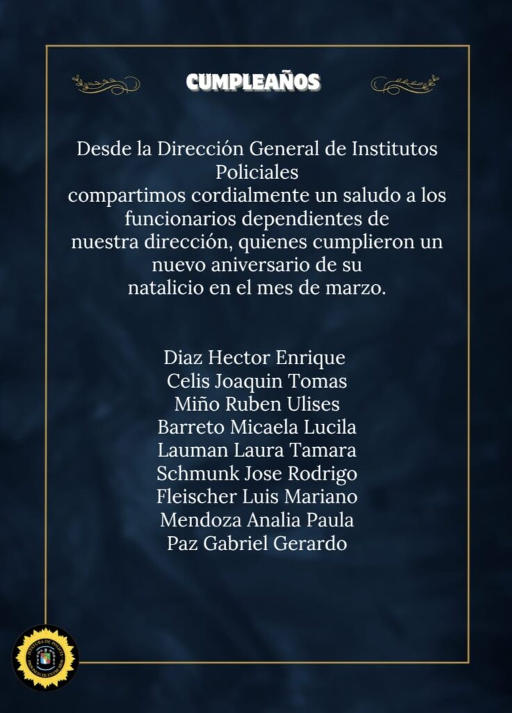 Saludamos de modo especial al Comisario Fernando Cabrera y la Cabo 1° Laura Lauman , por un año más de vida, y que tengan un hermoso años. Con cariño, la Dirección de Institutos Policiales.